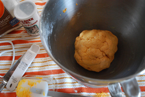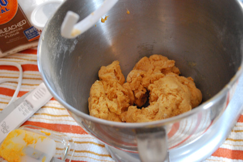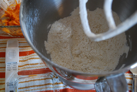 Switch your KitchenAid Mixer’s regular mixing attachment to the dough hook attachment instead. Add the sweet potato puree and let it stir until it turns into one big clump like this.