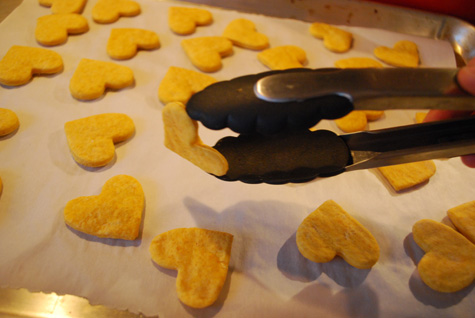 Cut using small cookie cutters. Here I’m using heart cookie cutters but I’ve also used these great mini-cookie cutters. Place on a jelly roll pan or cookie sheet lined with parchment paper.