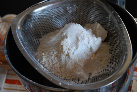, well …you should really get one, saves tons of time baking, but anyway go ahead and follow the original recipe instructions. Sift flour, baking powder, sugar and salt together into a large bowl. I don’t have a sifter so I use a colander.